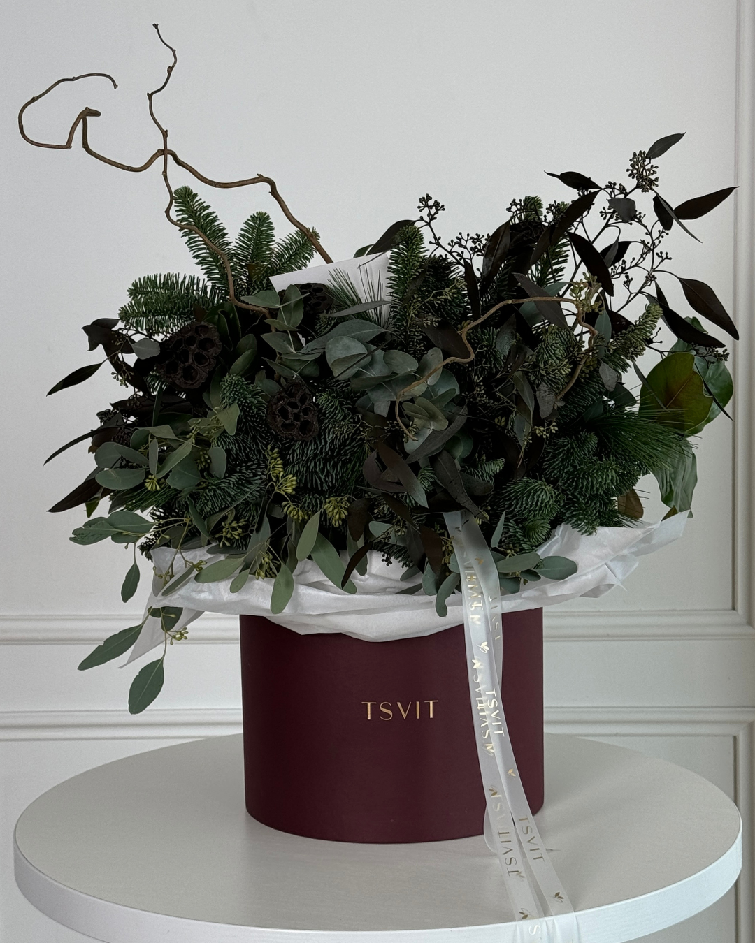 Christmas box arrangement made with a base of nobilis, magnolia, contorta branches, brown eucalyptus, pinus pine, evergreens