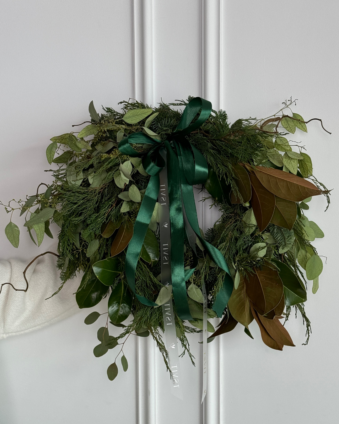 Christmas wreath made with a base of nobilis, evergreens, eucalyptus with berries, contorta branches, and magnolia