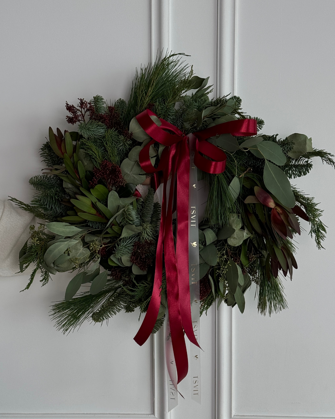 Christmas wreath made with a base of nobilis, burgundy eucalyptus, skimmia, and leucadendron