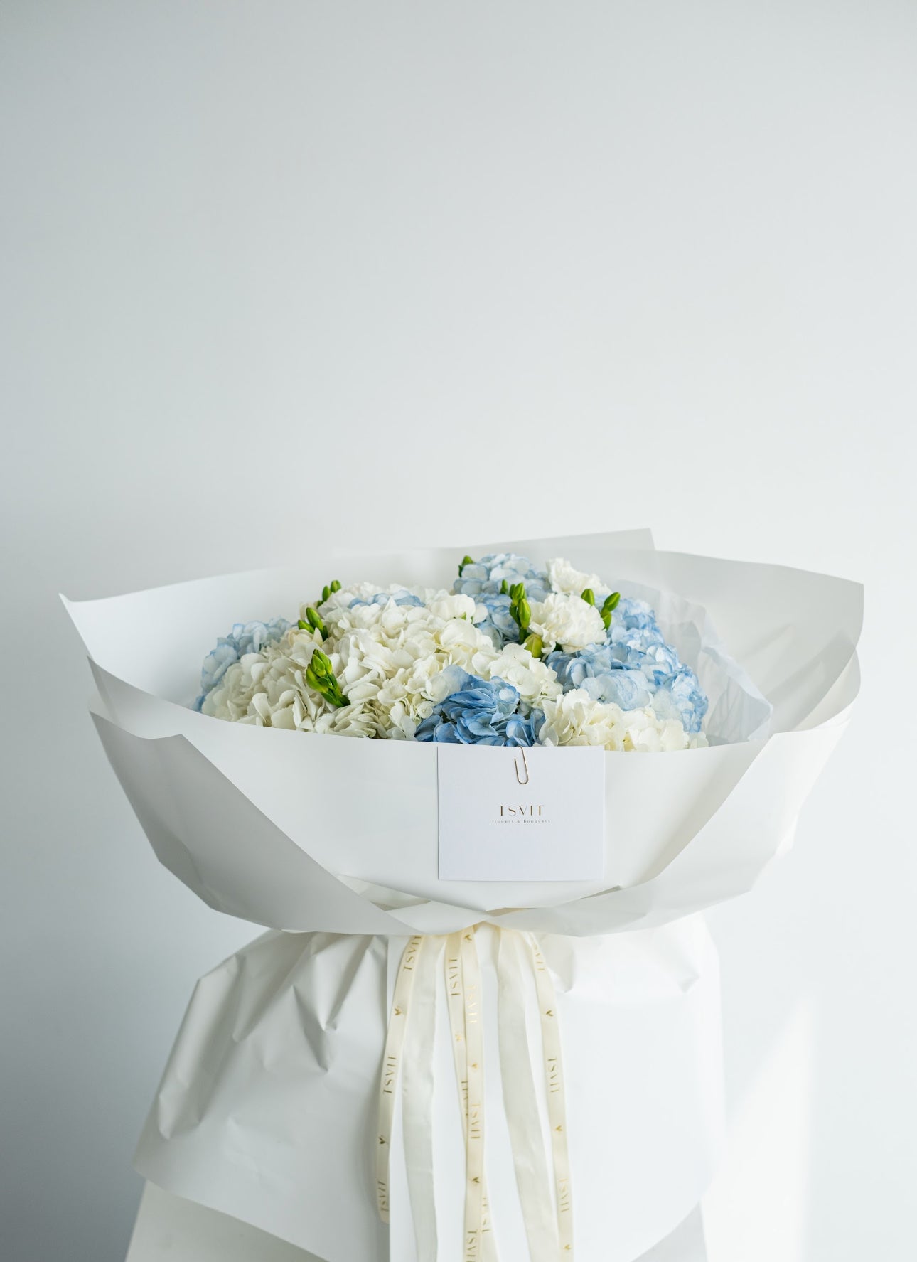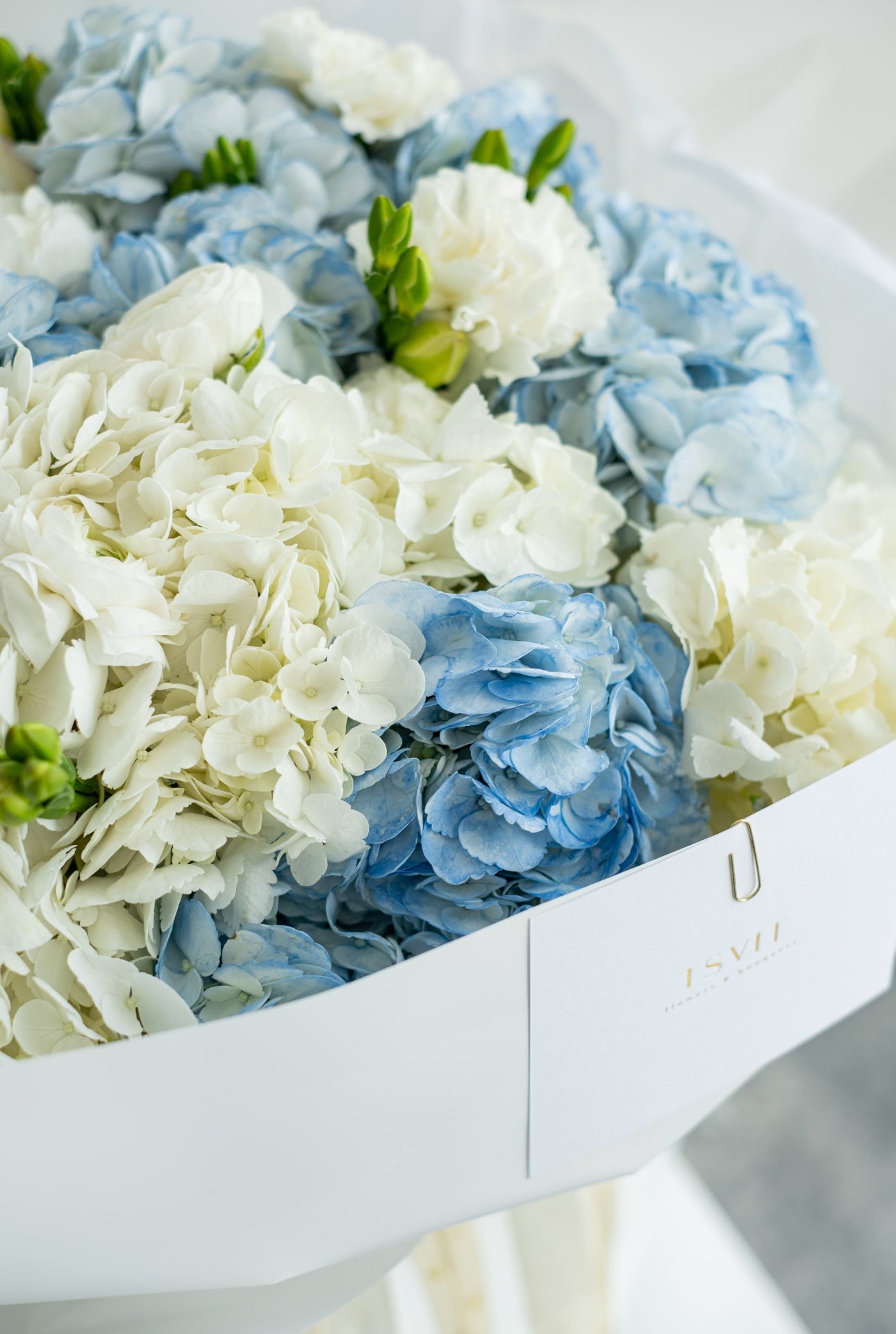 The bouquet is placed in an aqua box — be sure to take it out and place it in a vase with enough water.