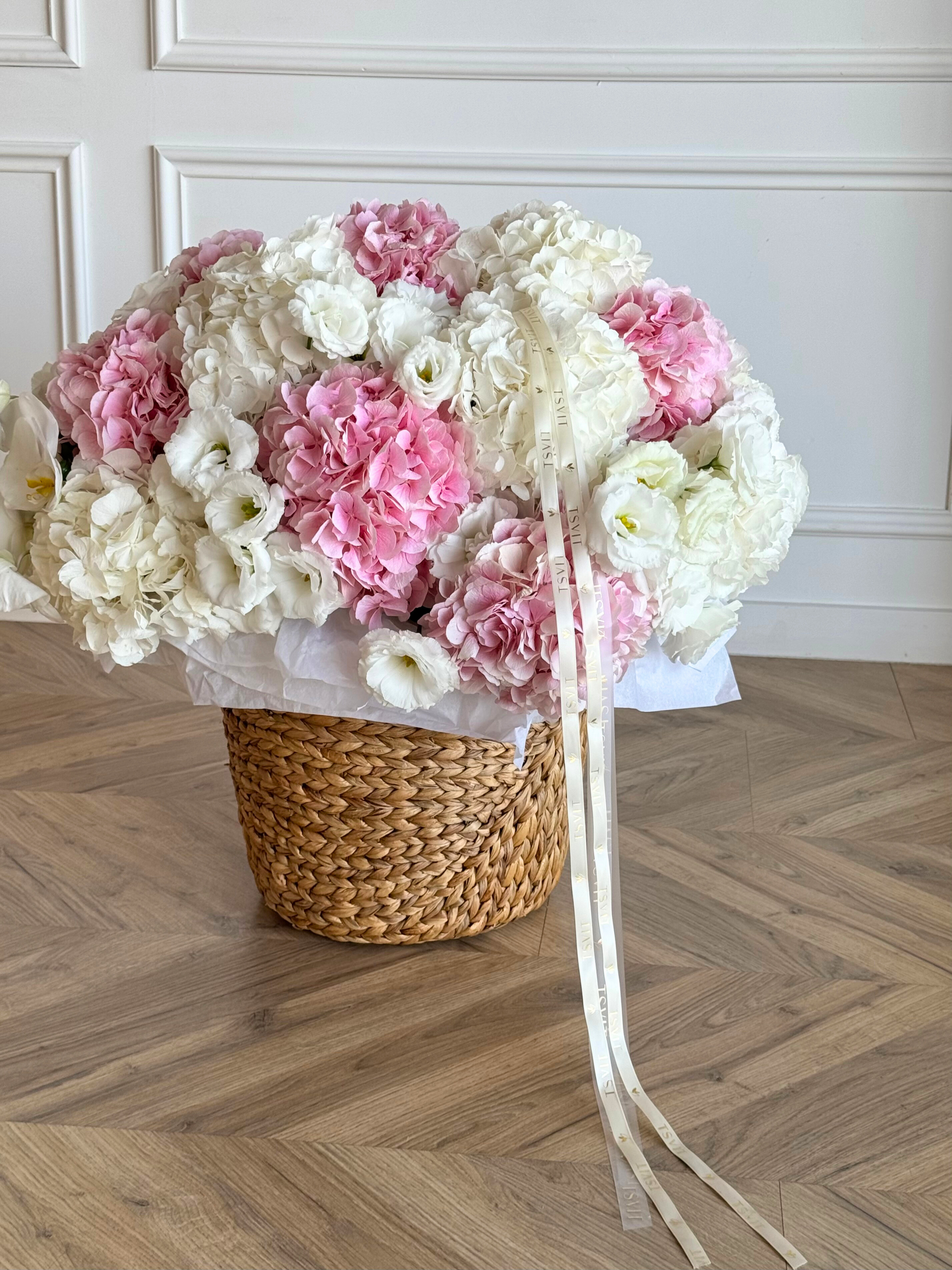 A basket of pink and white hydrangeas with eustoma and phalenopsis