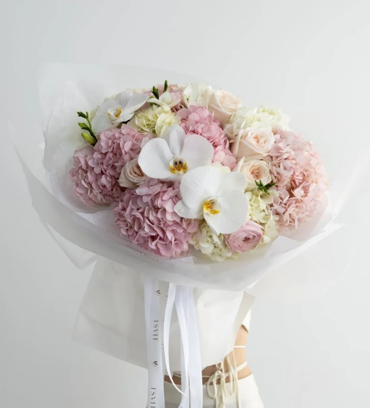 A mixed bouquet of hydrangeas, roses, phelenopsis