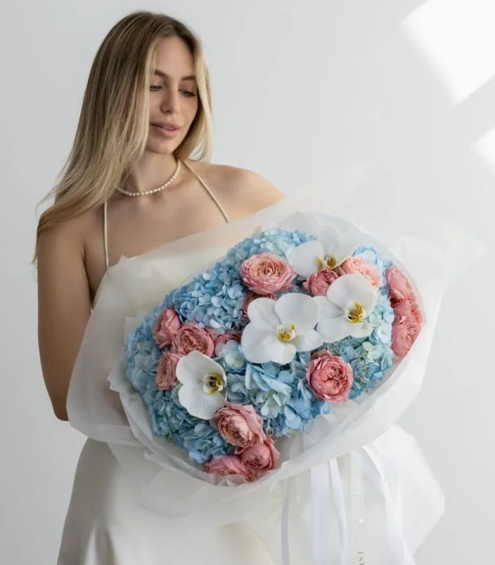 Gentle mix based on hydrangeas, roses and phalaenopsis
