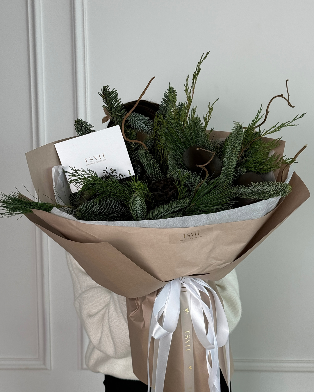 Christmas bouquet made with a base of nobilis, contorta branches, pinus pine, evergreens